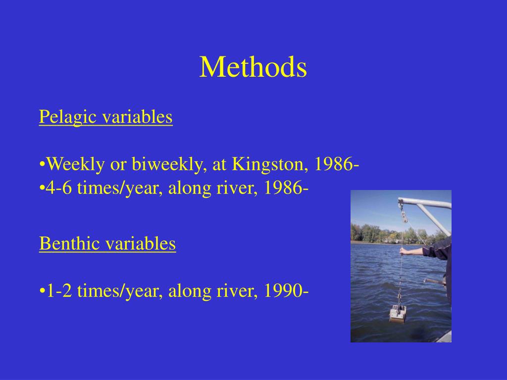 Methods • Pelagic variables • Weekly or biweekly, at Kingston, 1986- • 4-6 times/year, along river, 1986- • Benthic variables • 1-2 times/year, along river, 1990-