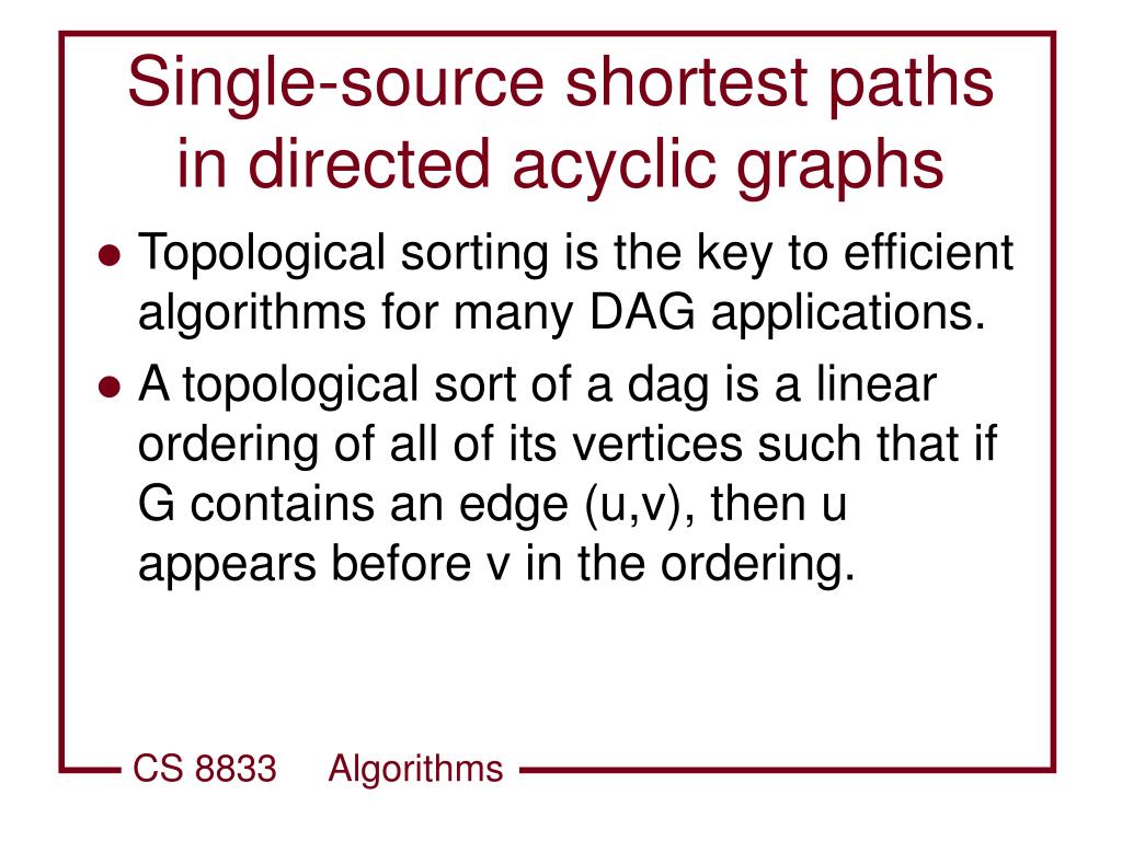 Single-source shortest paths in directed acyclic graphs • Topological sorting is the key to efficient algorithms for many DAG applications. • A topological sort of a dag is a linear ordering of all of its vertices such that if G contains an edge (u,v), then u appears before v in the ordering.