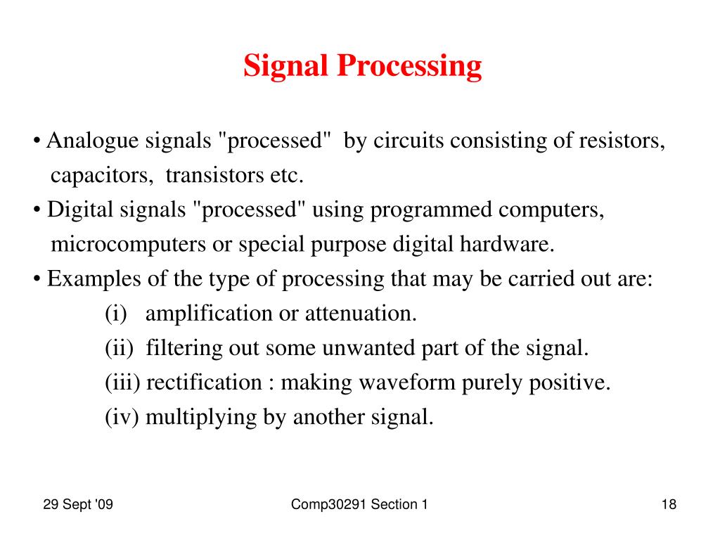 Signal Processing • Analogue signals "processed" by circuits consisting of resistors, capacitors, transistors etc. • Digital signals "processed" using programmed computers, microcomputers or special purpose digital hardware. • Examples of the type of processing that may be carried out are: • (i) amplification or attenuation. • (ii) filtering out some unwanted part of the signal. • (iii) rectification : making waveform purely positive. • (iv) multiplying by another signal. Comp30291 Section 1