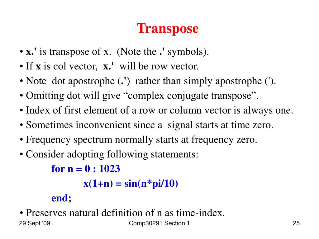 Transpose • x.' is transpose of x. (Note the .' symbols). • If x is col vector, x.' will be row vector. • Note dot apostrophe (.') rather than simply apostrophe ('). • Omitting dot will give “complex conjugate transpose”. • Index of first element of a row or column vector is always one. • Sometimes inconvenient since a signal starts at time zero. • Frequency spectrum normally starts at frequency zero. • Consider adopting following statements: • for n = 0 : 1023 • x(1+n) = sin(n*pi/10) • end; • Preserves natural definition of n as time-index. Comp30291 Section 1