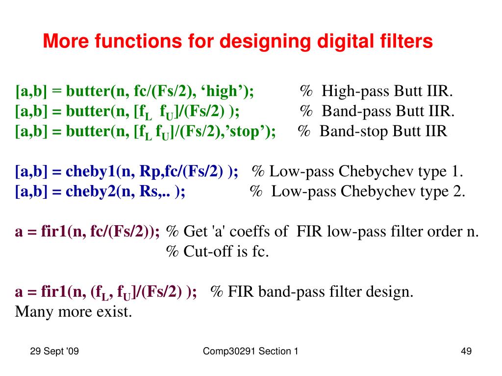More functions for designing digital filters [a,b] = butter(n, fc/(Fs/2), ‘high’); % High-pass Butt IIR. [a,b] = butter(n, [fL fU]/(Fs/2) ); % Band-pass Butt IIR. [a,b] = butter(n, [fL fU]/(Fs/2),’stop’); % Band-stop Butt IIR [a,b] = cheby1(n, Rp,fc/(Fs/2) );% Low-pass Chebychev type 1. [a,b] = cheby2(n, Rs,.. ); % Low-pass Chebychev type 2. a = fir1(n, fc/(Fs/2)); % Get 'a' coeffs of FIR low-pass filter order n. % Cut-off is fc. a = fir1(n, (fL, fU]/(Fs/2) ); % FIR band-pass filter design. Many more exist. Comp30291 Section 1