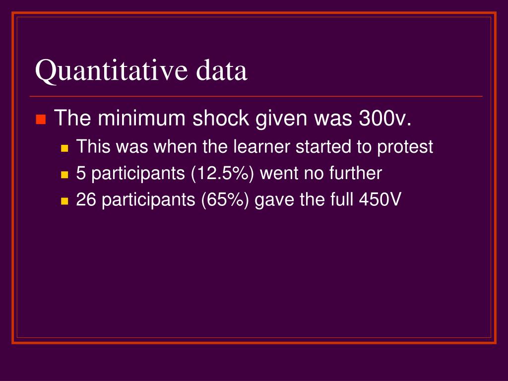 Quantitative data • The minimum shock given was 300v. • This was when the learner started to protest • 5 participants (12.5%) went no further • 26 participants (65%) gave the full 450V