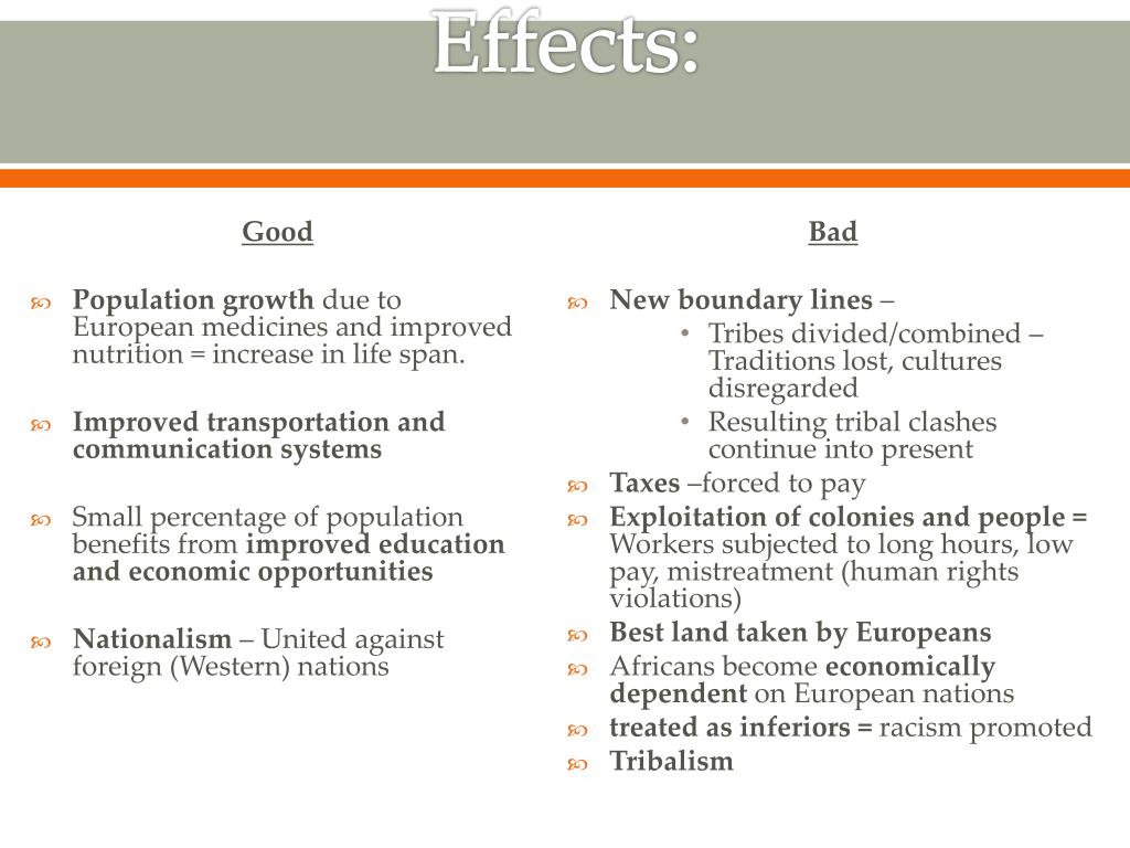 Good Population growth due to European medicines and improved nutrition = increase in life span. Improved transportation and communication systems Small percentage of population benefits from improved education and economic opportunities Nationalism – United against foreign (Western) nations Bad New boundary lines – Tribes divided/combined –Traditions lost, cultures disregarded Resulting tribal clashes continue into present Taxes–forced to pay Exploitation of colonies and people = Workers subjected to long hours, low pay, mistreatment (human rights violations) Best land taken by Europeans Africans become economically dependent on European nations treated as inferiors = racism promoted Tribalism Effects: