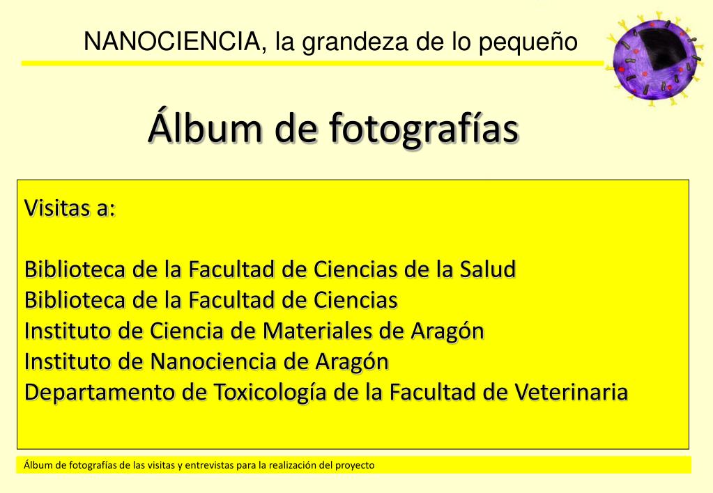 Álbum de fotografías. Visitas a: Biblioteca de la Facultad de Ciencias de la Salud Biblioteca de la Facultad de Ciencias Instituto de Ciencia de Materiales de Aragón Instituto de Nanociencia de Aragón Departamento de Toxicología de la Facultad de Veterinaria. Los miembros del grupo.