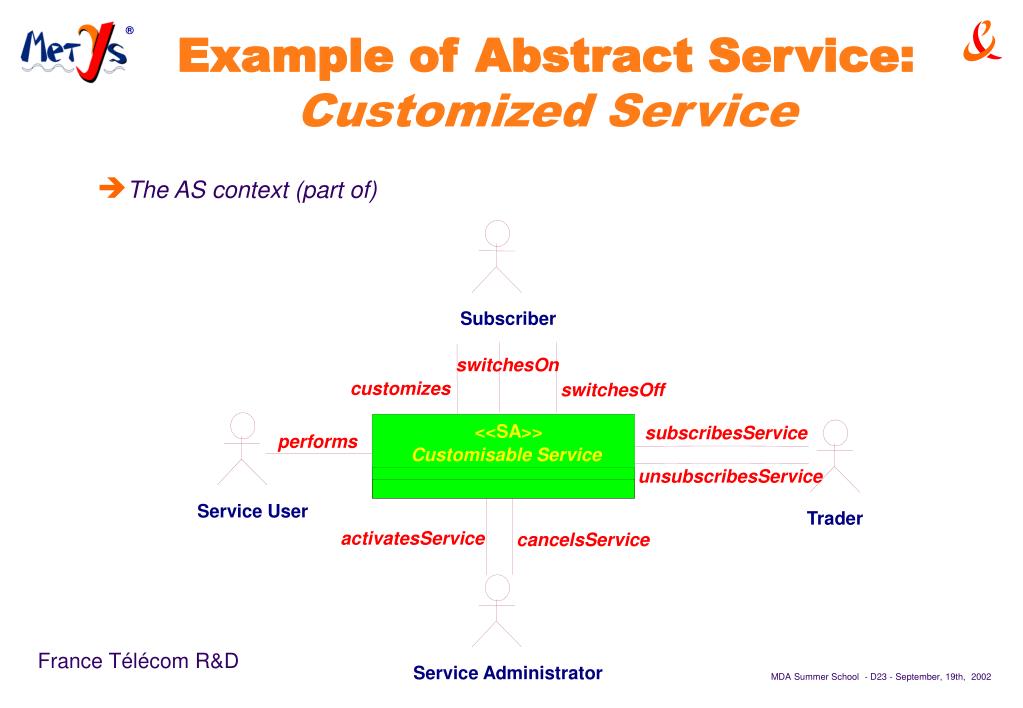 Example of Abstract Service: Customized Service • The AS context (part of) Subscriber switchesOn customizes switchesOff <<SA>> subscribesService performs Customisable Service unsubscribesService Service User Trader activatesService cancelsService Service Administrator