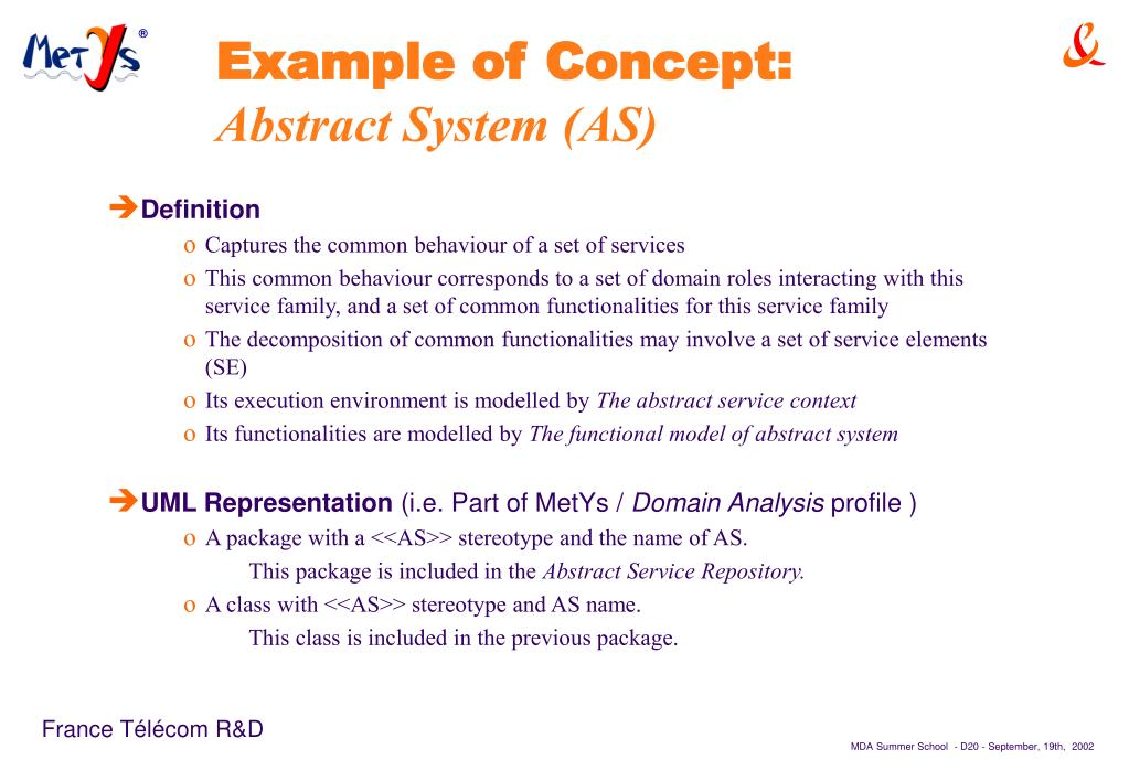Example of Concept: Abstract System (AS) • Definition • Captures the common behaviour of a set of services • This common behaviour corresponds to a set of domain roles interacting with this service family, and a set of common functionalities for this service family • The decomposition of common functionalities may involve a set of service elements (SE) • Its execution environment is modelled by The abstract service context • Its functionalities are modelled by The functional model of abstract system • UML Representation (i.e. Part of MetYs / Domain Analysis profile ) • A package with a <<AS>> stereotype and the name of AS. This package is included in the Abstract Service Repository. • A class with <<AS>> stereotype and AS name. This class is included in the previous package.