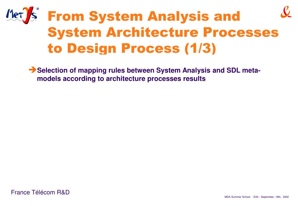 MDA experiment in Telecom Industry Bertrand NICOLAS bertrand.nicolas@francetelecom.com. Outline. MetYs ® and its processes Mainsprings for MetYs processes definition MetYs processes MetYs process description MetYs ® for IN telecom services modelling Domain analysis System analysis