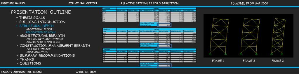 RELATIVE STIFFNESS FOR Y DIRECTION 2D MODEL FROM SAP 2000 • PRESENTATION OUTLINE • THESIS GOALS • BUILDING INTRODUCTION • STRUCTURAL DEPTH • ADDITIONAL FLOOR • RELOCATION TO UTAH • ARCHITECTURAL BREADTH • COLUMN GRID ADJUSTMENT • CHANGES TO FLOOR PLAN • CONSTRUCTION MANAGEMENT BREADTH • SCHEDULE IMPACT • COST ANALYSIS • SUMMARY RECOMMENDATIONS • THANKS • QUESTIONS FRAME 1 FRAME 2 FRAME 3