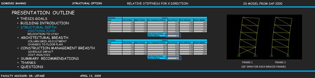 RELATIVE STIFFNESS FOR X DIRECTION 2D MODEL FROM SAP 2000 • PRESENTATION OUTLINE • THESIS GOALS • BUILDING INTRODUCTION • STRUCTURAL DEPTH • ADDITIONAL FLOOR • RELOCATION TO UTAH • ARCHITECTURAL BREADTH • COLUMN GRID ADJUSTMENT • CHANGES TO FLOOR PLAN • CONSTRUCTION MANAGEMENT BREADTH • SCHEDULE IMPACT • COST ANALYSIS • SUMMARY RECOMMENDATIONS • THANKS • QUESTIONS FRAME 1 FRAME 3 (30’ SPAN FOR EACH BRACED FRAME)