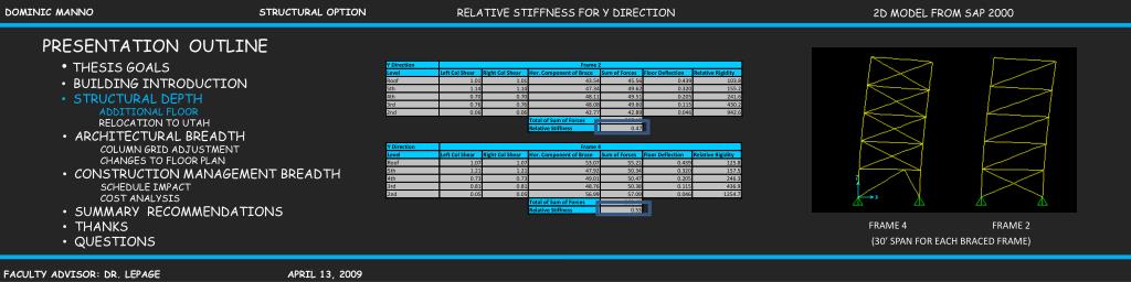 RELATIVE STIFFNESS FOR Y DIRECTION 2D MODEL FROM SAP 2000 • PRESENTATION OUTLINE • THESIS GOALS • BUILDING INTRODUCTION • STRUCTURAL DEPTH • ADDITIONAL FLOOR • RELOCATION TO UTAH • ARCHITECTURAL BREADTH • COLUMN GRID ADJUSTMENT • CHANGES TO FLOOR PLAN • CONSTRUCTION MANAGEMENT BREADTH • SCHEDULE IMPACT • COST ANALYSIS • SUMMARY RECOMMENDATIONS • THANKS • QUESTIONS FRAME 4 FRAME 2 (30’ SPAN FOR EACH BRACED FRAME)