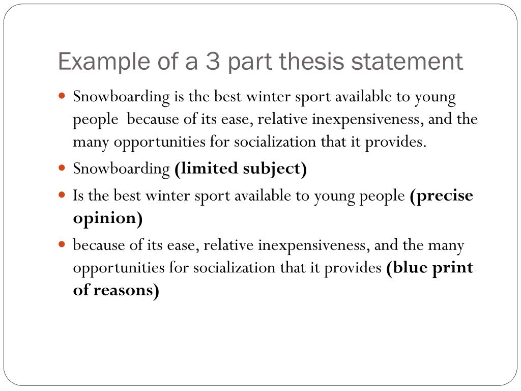 Example of a 3 part thesis statement • Snowboarding is the best winter sport available to young people because of its ease, relative inexpensiveness, and the many opportunities for socialization that it provides. • Snowboarding (limited subject) • Is the best winter sport available to young people (precise opinion) • because of its ease, relative inexpensiveness, and the many opportunities for socialization that it provides (blue print of reasons)