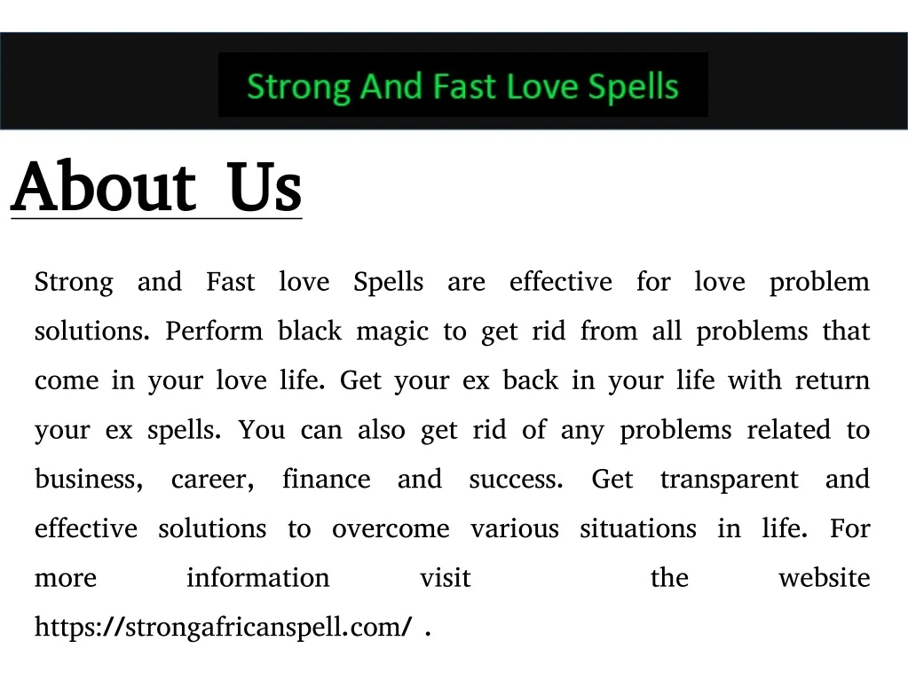 About Us Strong and Fast love Spells are effective for love problem solutions. Perform black magic to get rid from all problems that come in your love life. Get your ex back in your life with return your ex spells. You can also get rid of any problems related to business, career, finance and success. Get transparent and effective solutions to overcome various situations in life. For more information visit the website https://strongafricanspell.com/ .