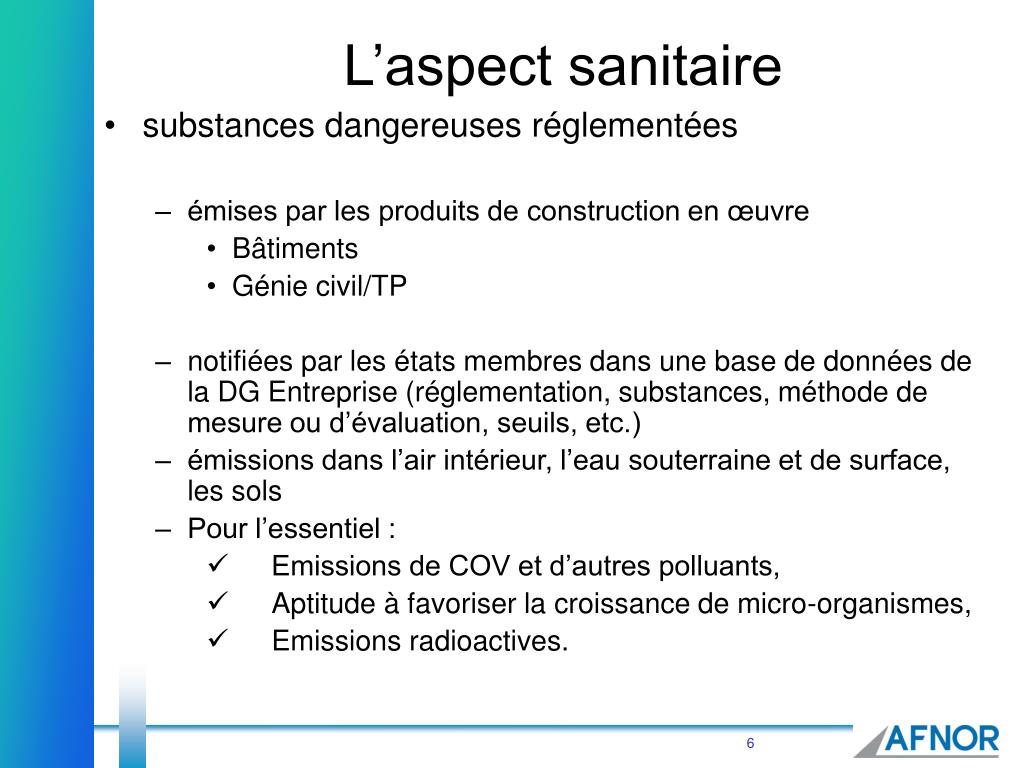 L’aspect sanitaire • substances dangereuses réglementées • émises par les produits de construction en œuvre • Bâtiments • Génie civil/TP • notifiées par les états membres dans une base de données de la DG Entreprise (réglementation, substances, méthode de mesure ou d’évaluation, seuils, etc.) • émissions dans l’air intérieur, l’eau souterraine et de surface, les sols • Pour l’essentiel : üEmissions de COV et d’autres polluants, üAptitude à favoriser la croissance de micro-organismes, üEmissions radioactives.
