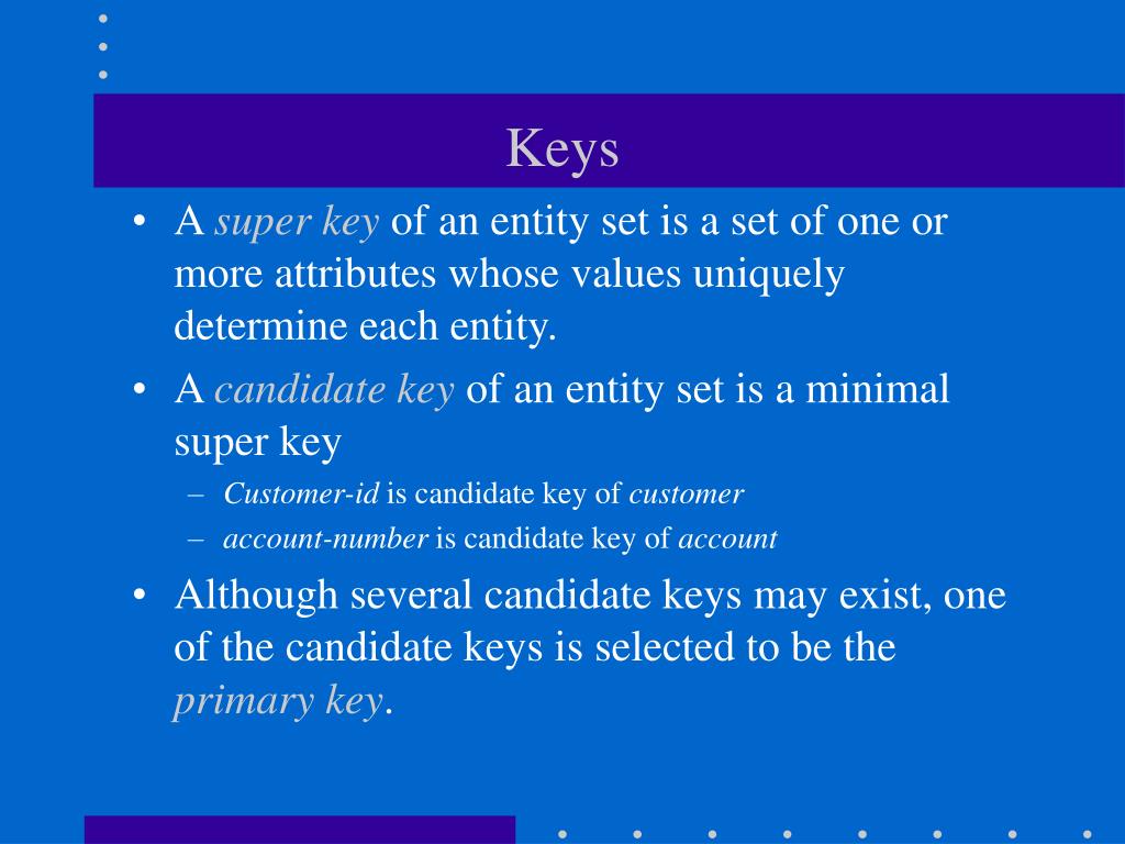 Keys • A super key of an entity set is a set of one or more attributes whose values uniquely determine each entity. • A candidate key of an entity set is a minimal super key • Customer-id is candidate key of customer • account-number is candidate key of account • Although several candidate keys may exist, one of the candidate keys is selected to be the primary key.