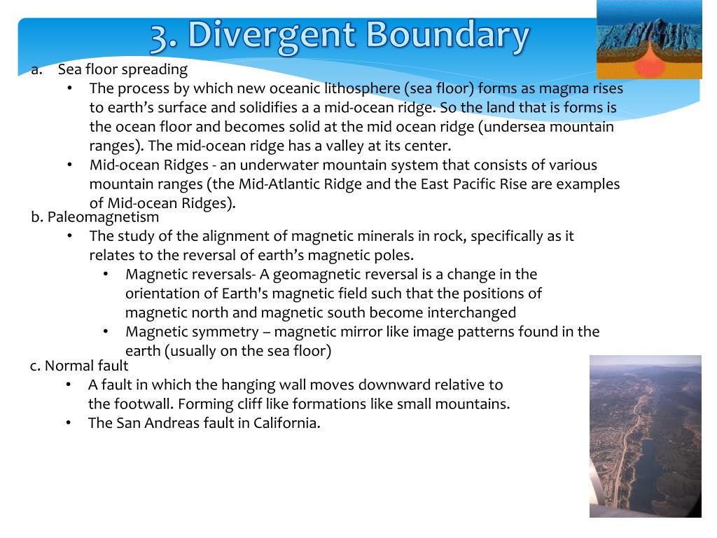 3. Divergent Boundary • Sea floor spreading • The process by which new oceanic lithosphere (sea floor) forms as magma rises to earth’s surface and solidifies a a mid-ocean ridge. So the land that is forms is the ocean floor and becomes solid at the mid ocean ridge (undersea mountain ranges). The mid-ocean ridge has a valley at its center. • Mid-ocean Ridges - an underwater mountain system that consists of various mountain ranges (the Mid-Atlantic Ridge and the East Pacific Rise are examples of Mid-ocean Ridges). • b. Paleomagnetism • The study of the alignment of magnetic minerals in rock, specifically as it relates to the reversal of earth’s magnetic poles. • Magnetic reversals- A geomagnetic reversal is a change in the orientation of Earth's magnetic field such that the positions of magnetic north and magnetic south become interchanged • Magnetic symmetry – magnetic mirror like image patterns found in the earth (usually on the sea floor) • c. Normal fault • A fault in which the hanging wall moves downward relative to the footwall. Forming cliff like formations like small mountains. • The San Andreas fault in California.