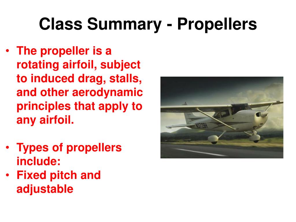 Class Summary - Propellers • The propeller is a rotating airfoil, subject to induced drag, stalls, and other aerodynamic principles that apply to any airfoil. • Types of propellers include: • Fixed pitch and adjustable