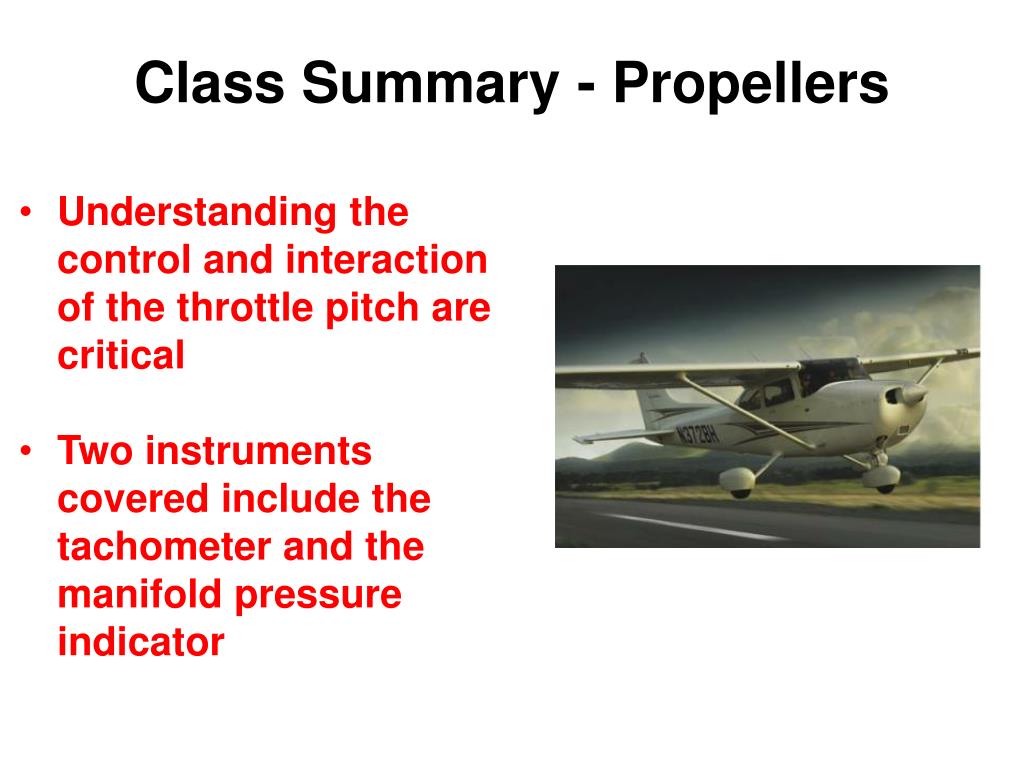 Class Summary - Propellers • Understanding the control and interaction of the throttle pitch are critical • Two instruments covered include the tachometer and the manifold pressure indicator