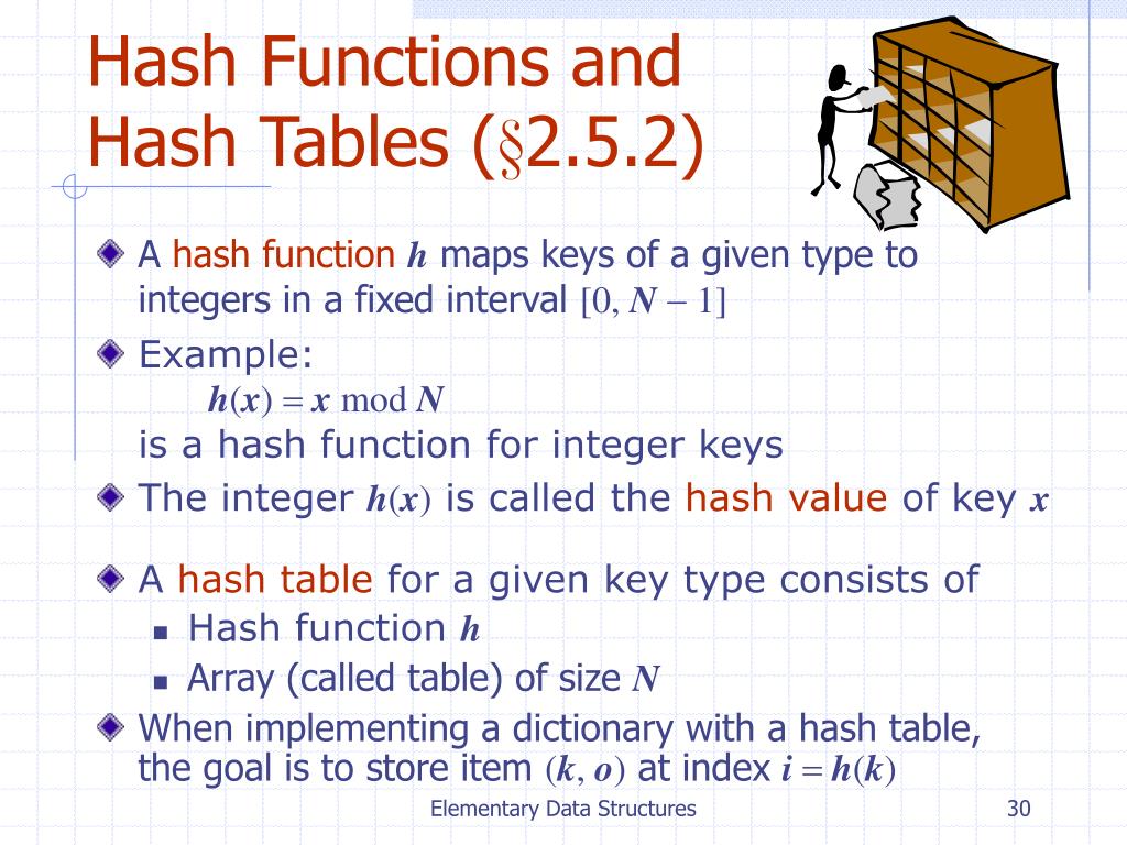 A hash function is usually specified as the composition of two functions: Hash code map:h1:keysintegers Compression map:h2: integers [0, N- 1] The hash code map is applied first, and the compression map is applied next on the result, i.e., h(x) = h2(h1(x)) The goal of the hash function is to “disperse” the keys in an apparently random way Hash Functions (§ 2.5.3) Elementary Data Structures
