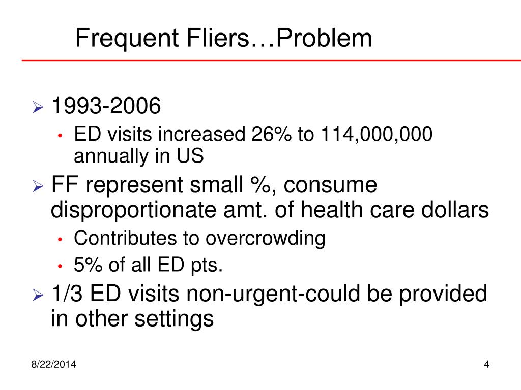 Frequent Fliers…Problem • 1993-2006 • ED visits increased 26% to 114,000,000 annually in US • FF represent small %, consume disproportionate amt. of health care dollars • Contributes to overcrowding • 5% of all ED pts. • 1/3 ED visits non-urgent-could be provided in other settings