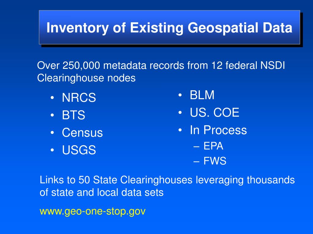 NRCS BTS Census USGS BLM US. COE In Process EPA FWS Inventory of Existing Geospatial Data Over 250,000 metadata records from 12 federal NSDI Clearinghouse nodes Links to 50 State Clearinghouses leveraging thousands of state and local data sets www.geo-one-stop.gov