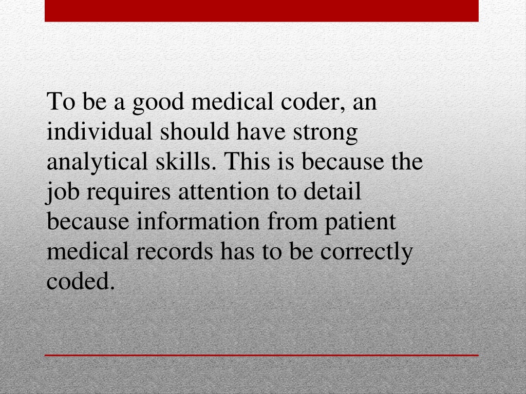 To be a good medical coder, an individual should have strong analytical skills. This is because the job requires attention to detail because information from patient medical records has to be correctly coded.