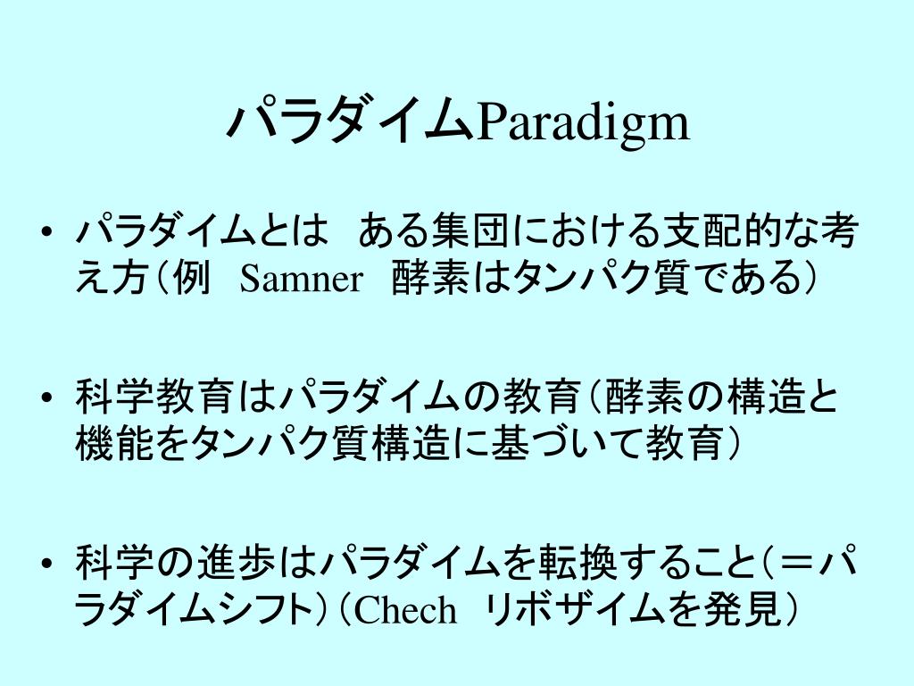 パラダイムParadigm • パラダイムとは ある集団における支配的な考え方(例 Samner 酵素はタンパク質である) • 科学教育はパラダイムの教育(酵素の構造と機能をタンパク質構造に基づいて教育) • 科学の進歩はパラダイムを転換すること(=パラダイムシフト)(Chech リボザイムを発見)