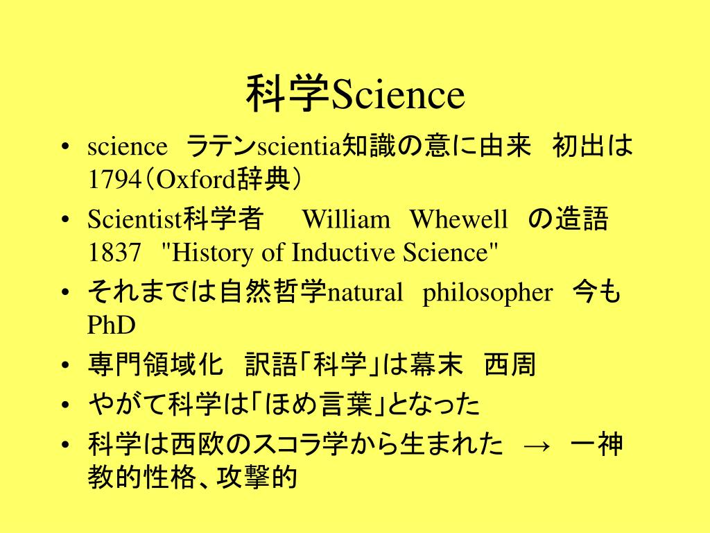科学Science • science ラテンscientia知識の意に由来 初出は1794(Oxford辞典) • Scientist科学者 WilliamWhewell の造語1837"History of Inductive Science" • それまでは自然哲学naturalphilosopher 今もPhD • 専門領域化 訳語「科学」は幕末 西周 • やがて科学は「ほめ言葉」となった • 科学は西欧のスコラ学から生まれた → 一神教的性格、攻撃的