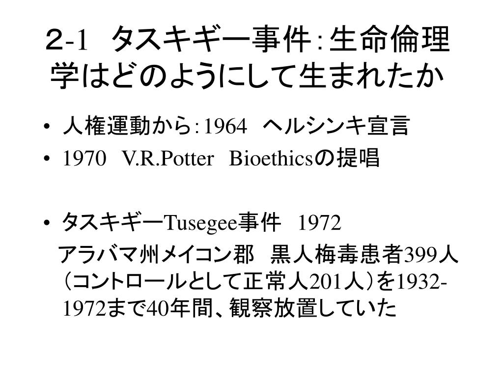 2-1 タスキギー事件:生命倫理学はどのようにして生まれたか2-1 タスキギー事件:生命倫理学はどのようにして生まれたか • 人権運動から:1964 ヘルシンキ宣言 • 1970V.R.PotterBioethicsの提唱 • タスキギーTusegee事件 1972 アラバマ州メイコン郡 黒人梅毒患者399人(コントロールとして正常人201人)を1932-1972まで40年間、観察放置していた