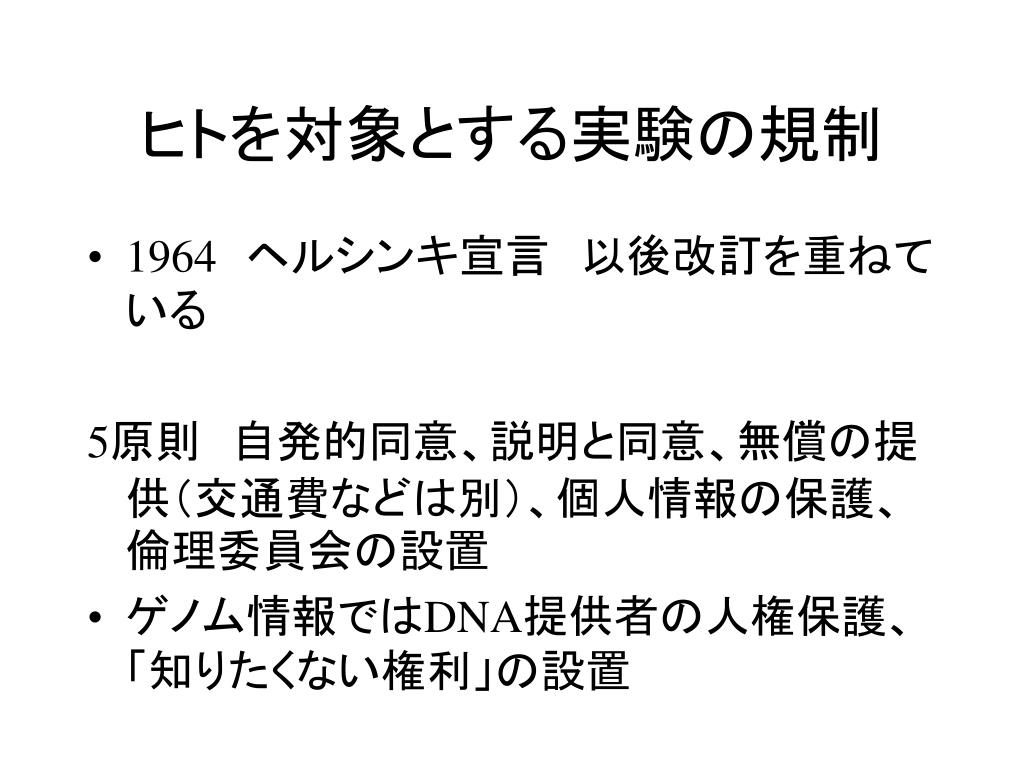 ヒトを対象とする実験の規制 • 1964 ヘルシンキ宣言 以後改訂を重ねている 5原則 自発的同意、説明と同意、無償の提供(交通費などは別)、個人情報の保護、倫理委員会の設置 • ゲノム情報ではDNA提供者の人権保護、「知りたくない権利」の設置
