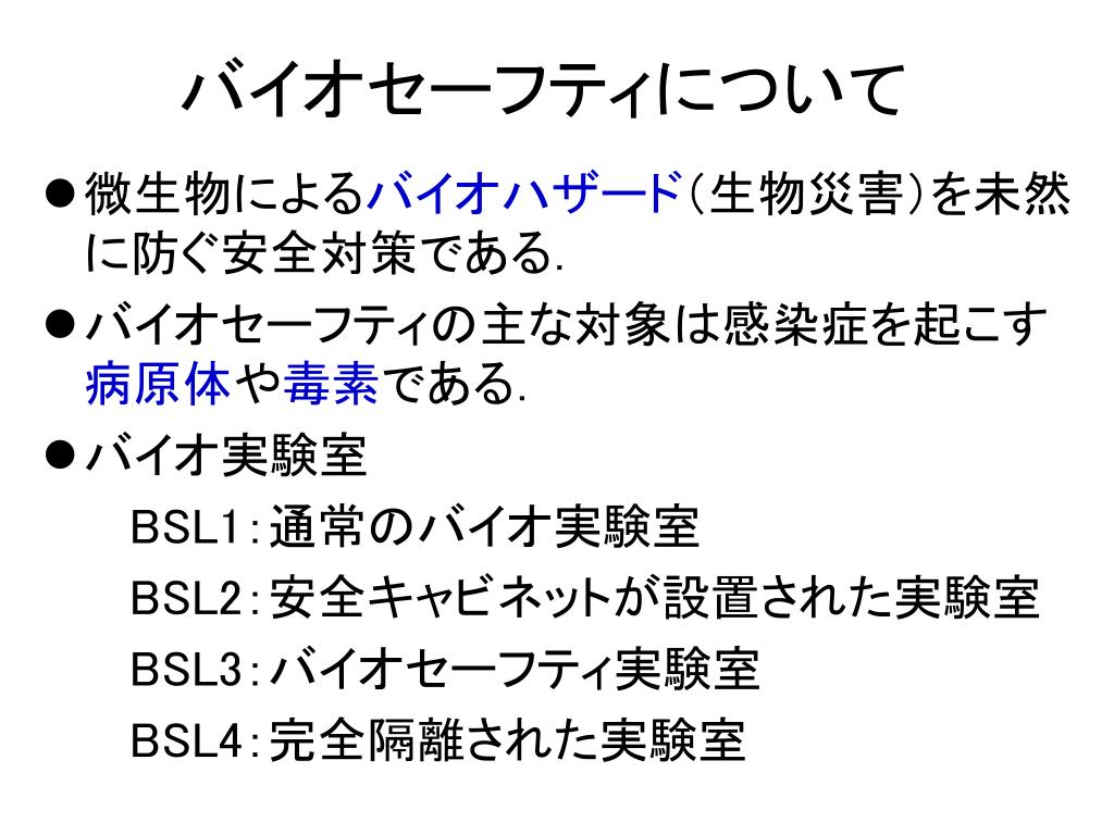 バイオセーフティについて • 微生物によるバイオハザード(生物災害)を未然に防ぐ安全対策である. • バイオセーフティの主な対象は感染症を起こす病原体や毒素である. • バイオ実験室 BSL1:通常のバイオ実験室 BSL2:安全キャビネットが設置された実験室 BSL3:バイオセーフティ実験室 BSL4:完全隔離された実験室