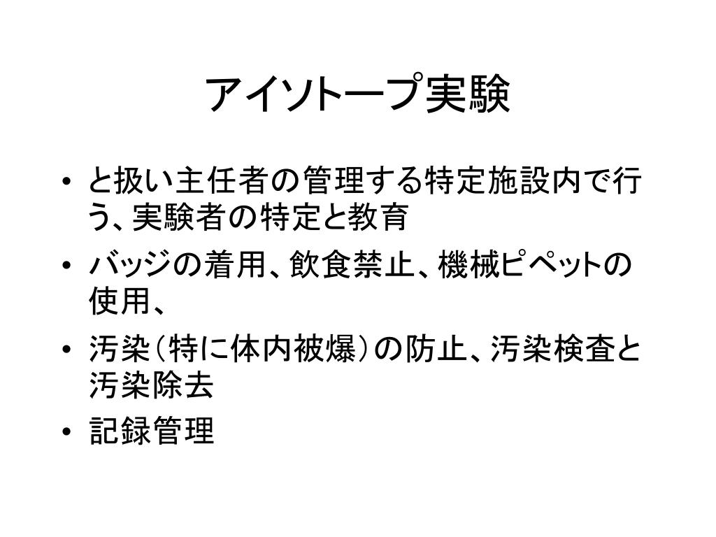 アイソトープ実験 • と扱い主任者の管理する特定施設内で行う、実験者の特定と教育 • バッジの着用、飲食禁止、機械ピペットの使用、 • 汚染(特に体内被爆)の防止、汚染検査と汚染除去 • 記録管理