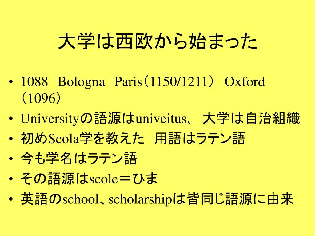 大学は西欧から始まった • 1088BolognaParis(1150/1211) Oxford (1096) • Universityの語源はuniveitus、 大学は自治組織 • 初めScola学を教えた 用語はラテン語 • 今も学名はラテン語 • その語源はscole=ひま • 英語のschool、scholarshipは皆同じ語源に由来