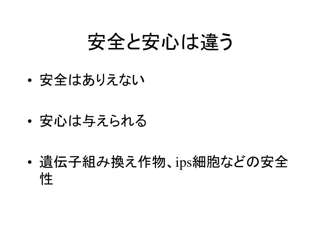 安全と安心は違う • 安全はありえない • 安心は与えられる • 遺伝子組み換え作物、ips細胞などの安全性