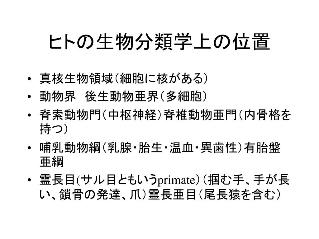 ヒトの生物分類学上の位置 • 真核生物領域(細胞に核がある) • 動物界 後生動物亜界(多細胞) • 脊索動物門(中枢神経)脊椎動物亜門(内骨格を持つ) • 哺乳動物綱(乳腺・胎生・温血・異歯性)有胎盤亜綱 • 霊長目(サル目ともいうprimate)(掴む手、手が長い、鎖骨の発達、爪)霊長亜目(尾長猿を含む)