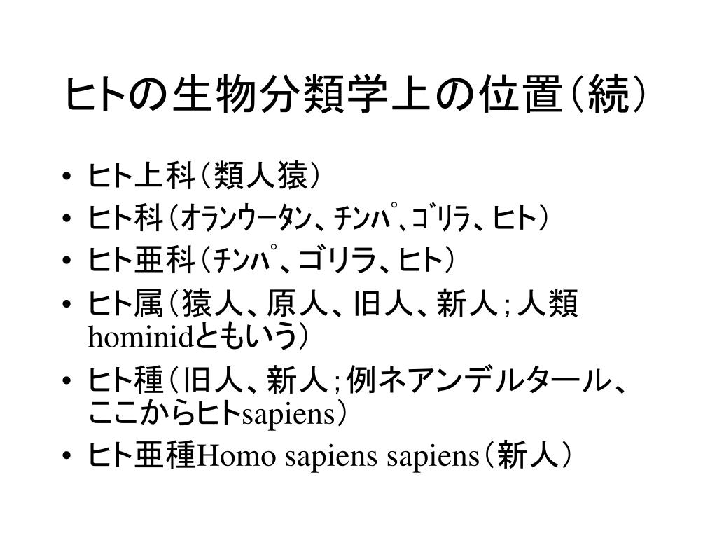 ヒトの生物分類学上の位置(続) • ヒト上科(類人猿) • ヒト科(オランウータン、チンパ、ゴリラ、ヒト) • ヒト亜科(チンパ、ゴリラ、ヒト) • ヒト属(猿人、原人、旧人、新人;人類hominidともいう) • ヒト種(旧人、新人;例ネアンデルタール、ここからヒトsapiens) • ヒト亜種Homo sapiens sapiens(新人)