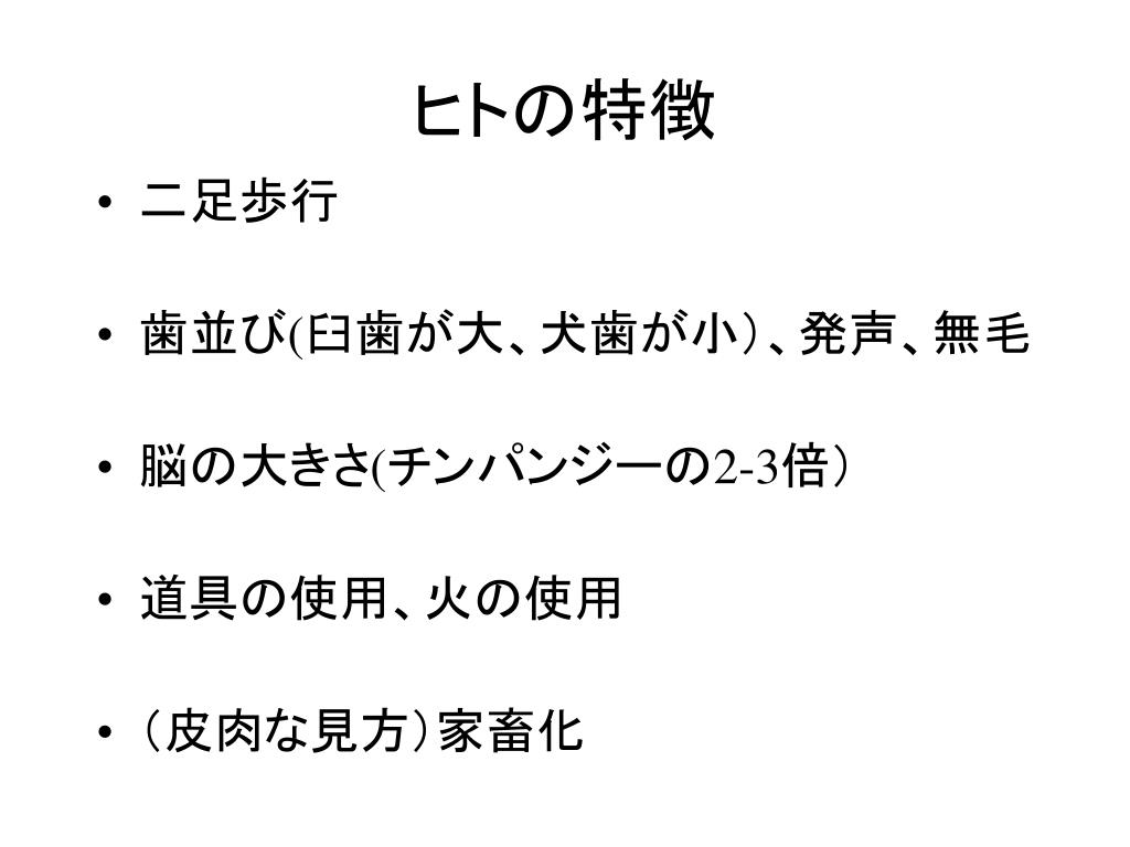 ヒトの特徴 • 二足歩行 • 歯並び(臼歯が大、犬歯が小)、発声、無毛 • 脳の大きさ(チンパンジーの2-3倍) • 道具の使用、火の使用 • (皮肉な見方)家畜化