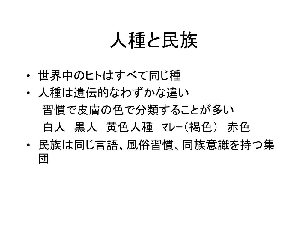 人種と民族 • 世界中のヒトはすべて同じ種 • 人種は遺伝的なわずかな違い 習慣で皮膚の色で分類することが多い 白人 黒人 黄色人種 マレー(褐色) 赤色 • 民族は同じ言語、風俗習慣、同族意識を持つ集団