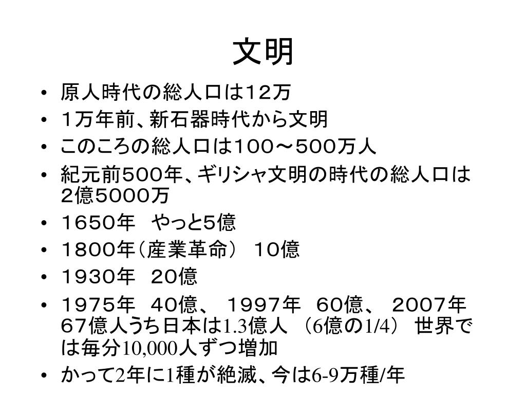 文明 • 原人時代の総人口は12万 • 1万年前、新石器時代から文明 • このころの総人口は100~500万人 • 紀元前500年、ギリシャ文明の時代の総人口は2億5000万 • 1650年 やっと5億 • 1800年(産業革命) 10億 • 1930年 20億 • 1975年 40億、 1997年 60億、 2007年 67億人うち日本は1.3億人 (6億の1/4) 世界では毎分10,000人ずつ増加 • かって2年に1種が絶滅、今は6-9万種/年
