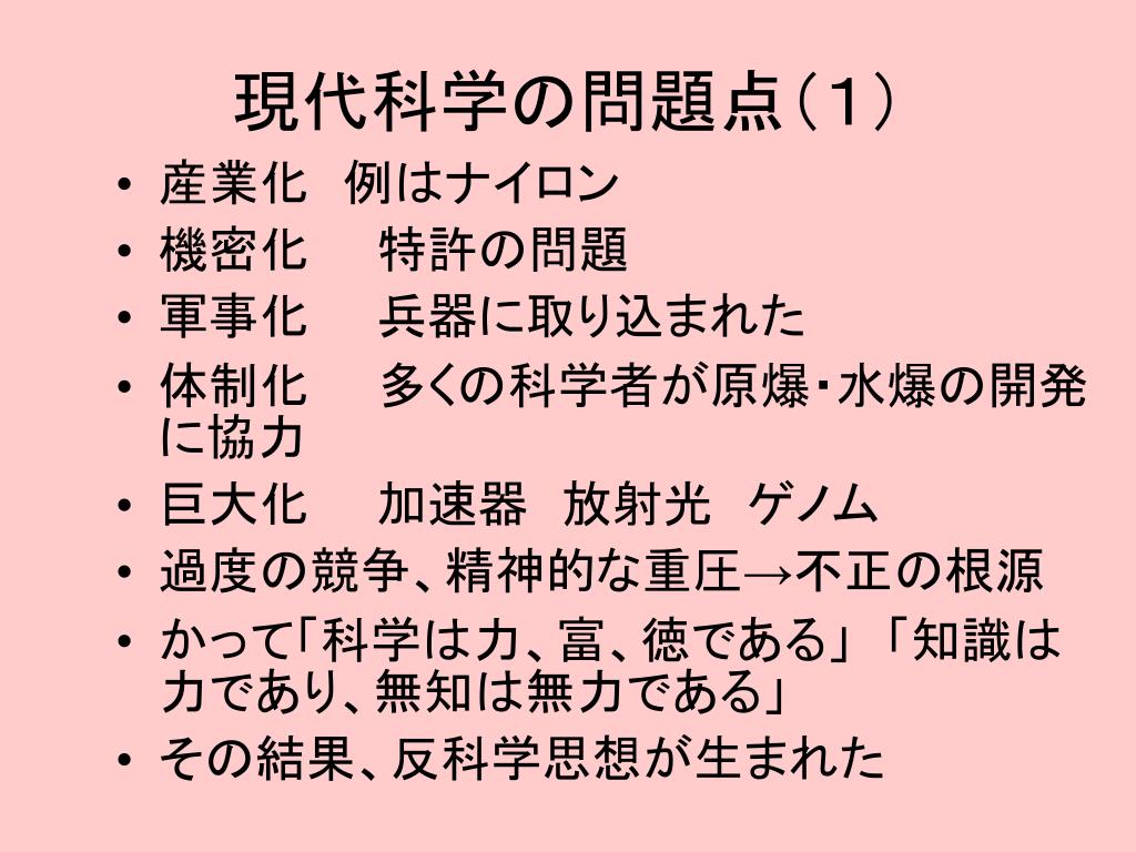 現代科学の問題点(1) • 産業化 例はナイロン • 機密化 特許の問題 • 軍事化 兵器に取り込まれた • 体制化 多くの科学者が原爆・水爆の開発に協力 • 巨大化 加速器 放射光 ゲノム • 過度の競争、精神的な重圧→不正の根源 • かって「科学は力、富、徳である」 「知識は力であり、無知は無力である」 • その結果、反科学思想が生まれた