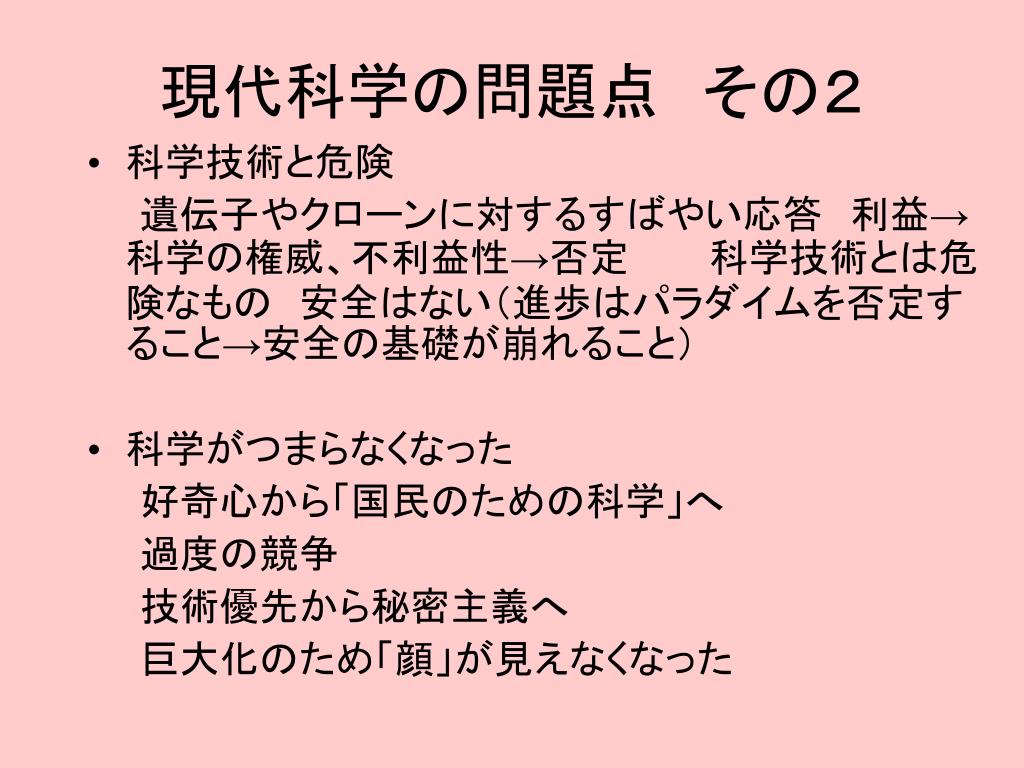 現代科学の問題点 その2 • 科学技術と危険 遺伝子やクローンに対するすばやい応答 利益→科学の権威、不利益性→否定 科学技術とは危険なもの 安全はない(進歩はパラダイムを否定すること→安全の基礎が崩れること) • 科学がつまらなくなった 好奇心から「国民のための科学」へ 過度の競争 技術優先から秘密主義へ 巨大化のため「顔」が見えなくなった