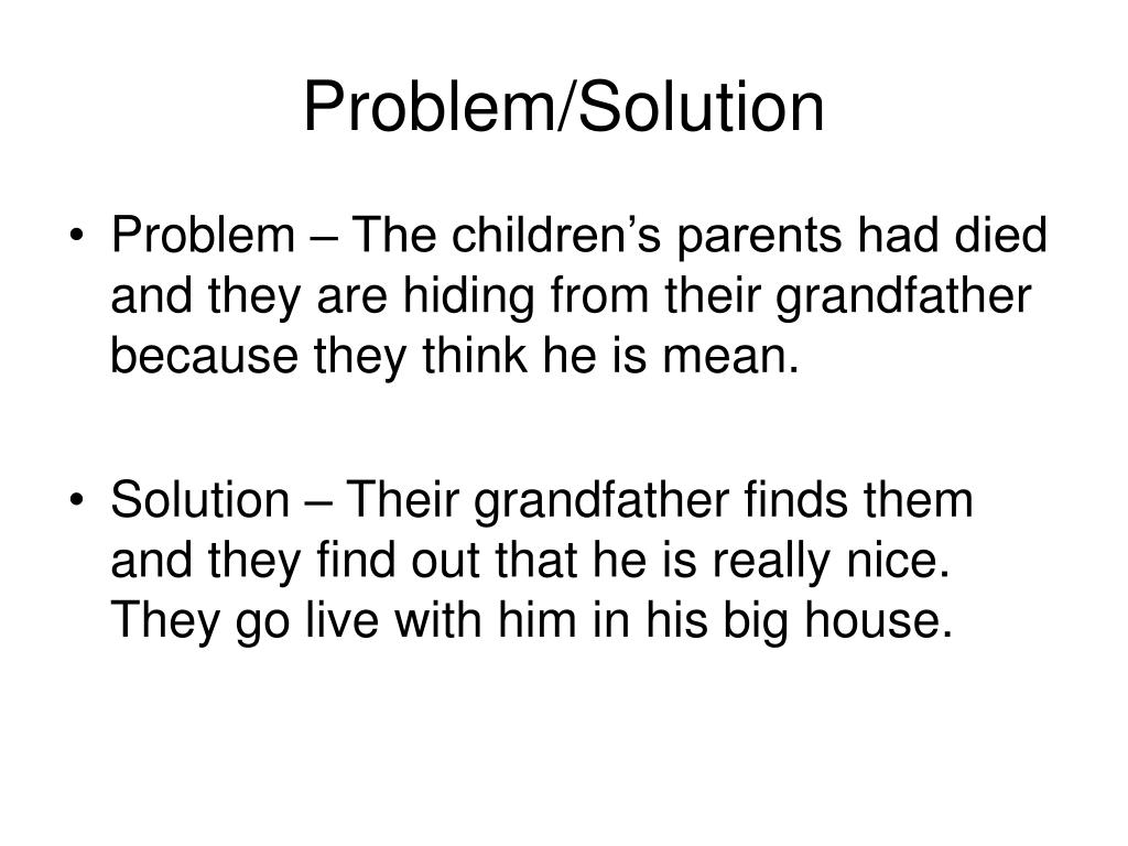Problem/Solution • Problem – The children’s parents had died and they are hiding from their grandfather because they think he is mean. • Solution – Their grandfather finds them and they find out that he is really nice. They go live with him in his big house.