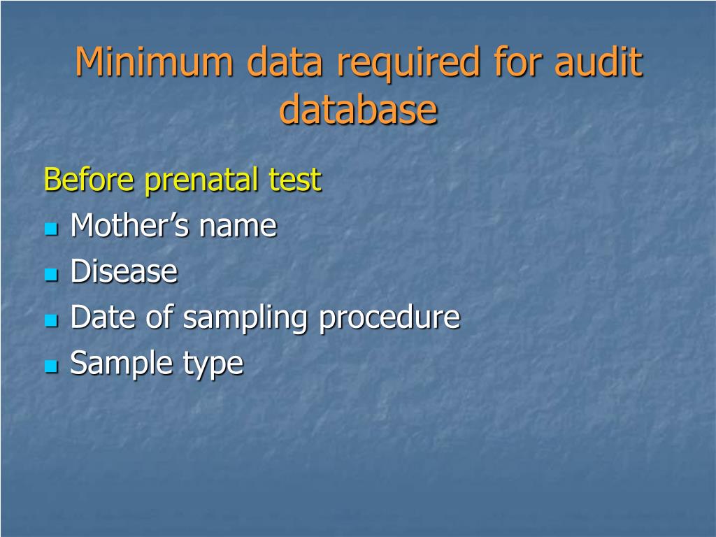 Minimum data required for audit database Before prenatal test • Mother’s name • Disease • Date of sampling procedure • Sample type
