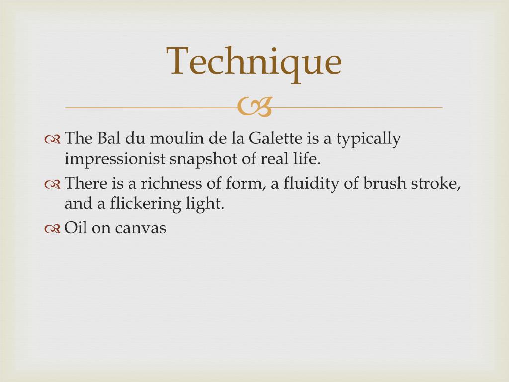Technique • The Bal du moulin de la Galette is a typically impressionist snapshot of real life. • There is a richness of form, a fluidity of brush stroke, and a flickering light. • Oil on canvas