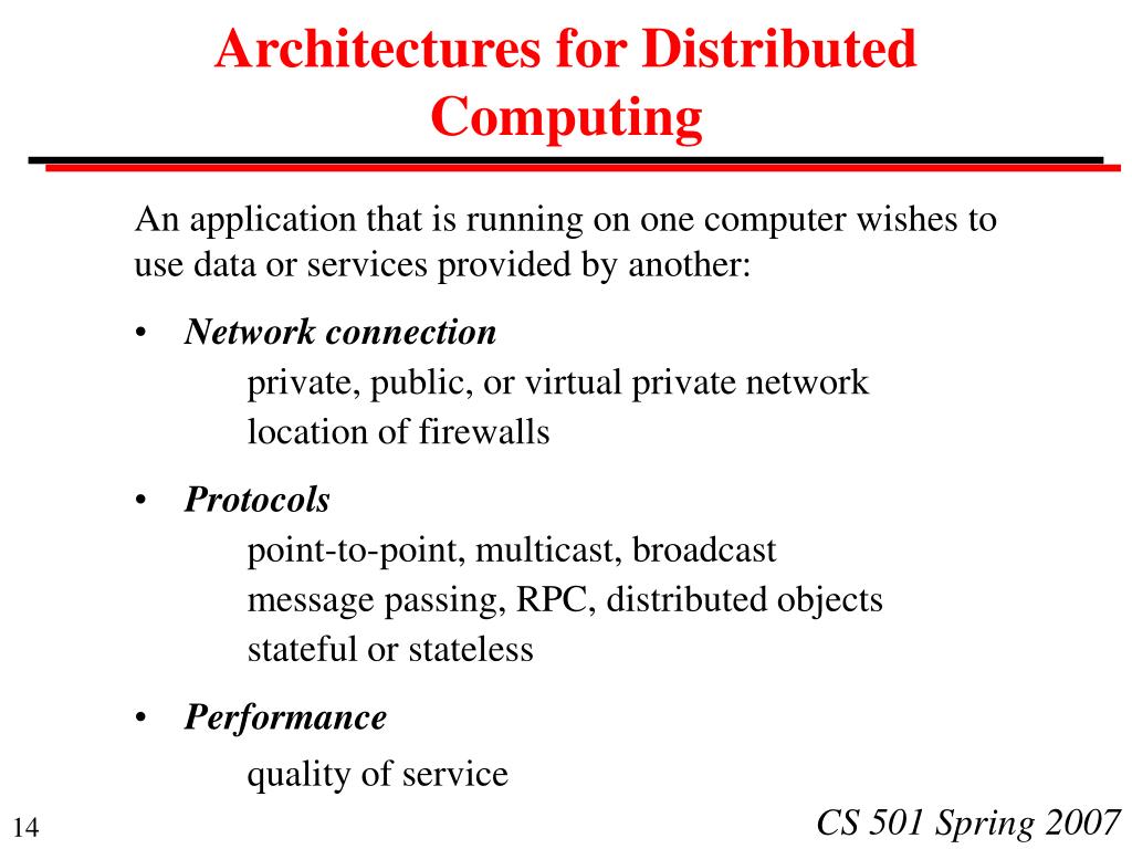 Architectures for Distributed Computing An application that is running on one computer wishes to use data or services provided by another: • Network connection private, public, or virtual private network location of firewalls • Protocols point-to-point, multicast, broadcast message passing, RPC, distributed objects stateful or stateless • Performance quality of service