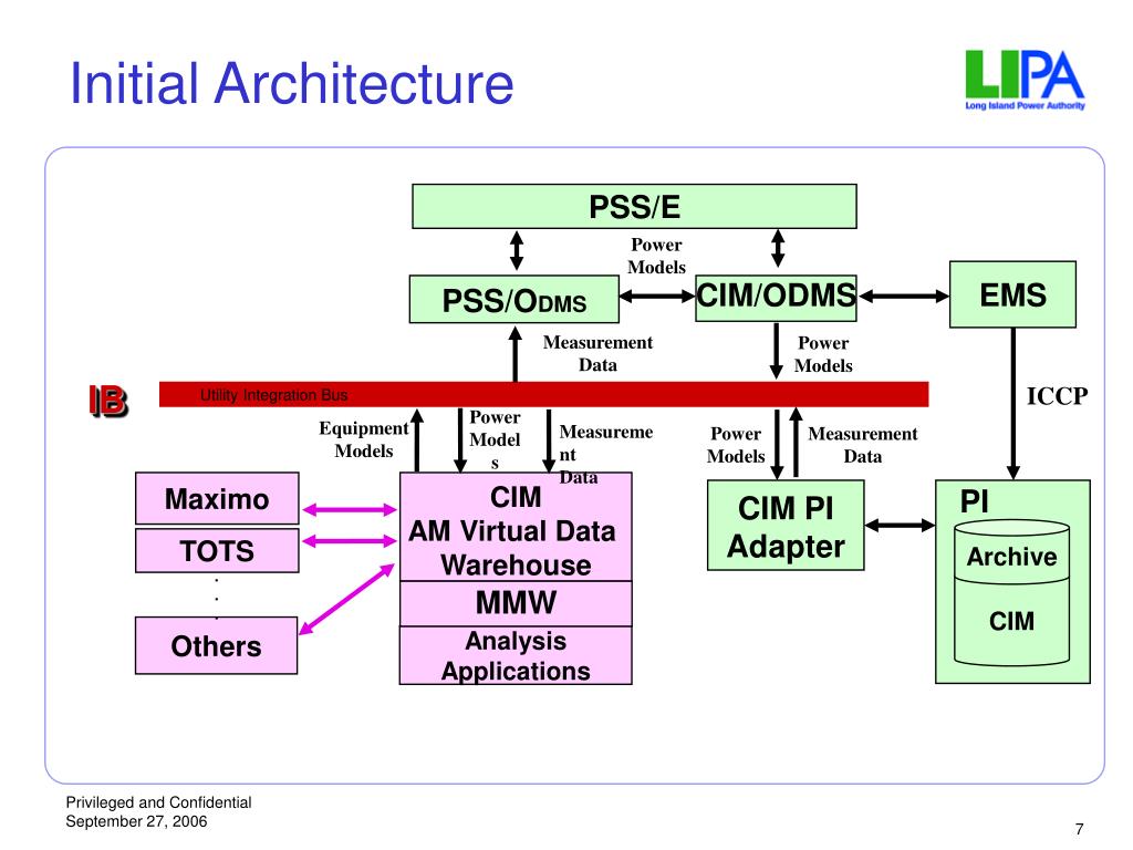PSS/E Power Models EMS PSS/ODMS CIM/ODMS Measurement Data Power Models IB ICCP Power Models Equipment Models Measurement Data Power Models Measurement Data PI CIM PI Adapter Maximo CIM AM Virtual Data Warehouse Archive TOTS CIM ... MMW Others Analysis Applications Initial Architecture Utility Integration Bus