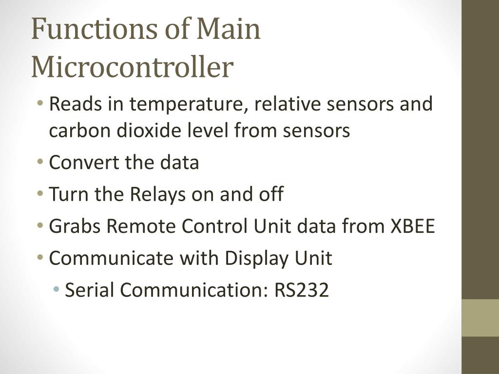 Functions of Main Microcontroller • Reads in temperature, relative sensors and carbon dioxide level from sensors • Convert the data • Turn the Relays on and off • Grabs Remote Control Unit data from XBEE • Communicate with Display Unit • Serial Communication: RS232