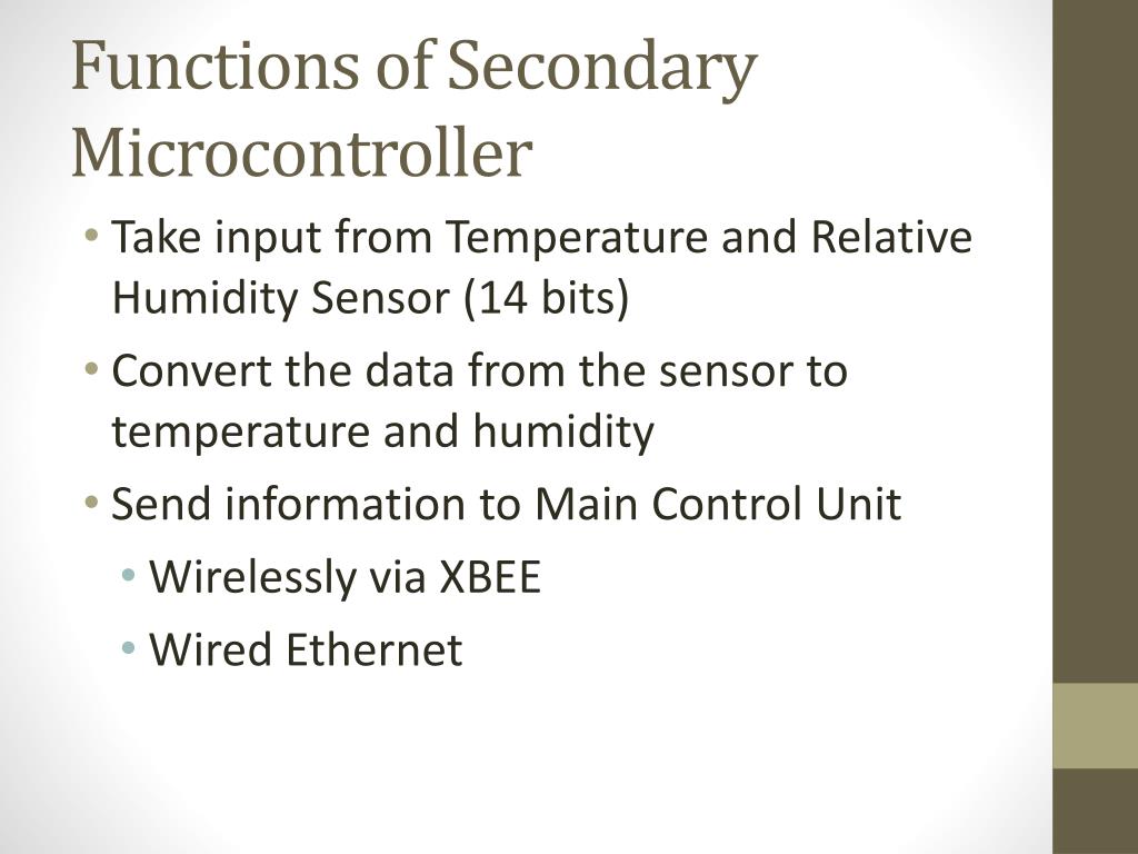 Functions of Secondary Microcontroller • Take input from Temperature and Relative Humidity Sensor (14 bits) • Convert the data from the sensor to temperature and humidity • Send information to Main Control Unit • Wirelessly via XBEE • Wired Ethernet