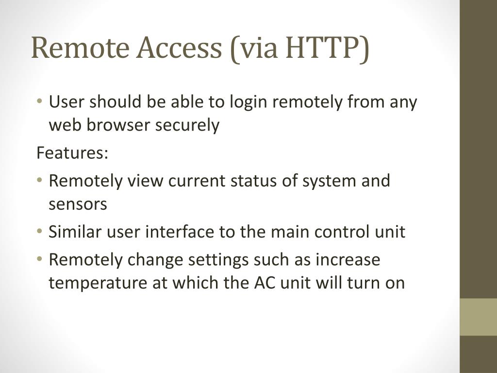 Remote Access (via HTTP) • User should be able to login remotely from any web browser securely Features: • Remotely view current status of system and sensors • Similar user interface to the main control unit • Remotely change settings such as increase temperature at which the AC unit will turn on