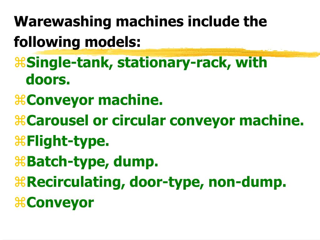Warewashing machines include the following models: • Single-tank, stationary-rack, with doors. • Conveyor machine. • Carousel or circular conveyor machine. • Flight-type. • Batch-type, dump. • Recirculating, door-type, non-dump. • Conveyor