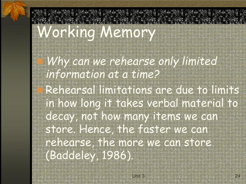Working Memory • Why can we rehearse only limited information at a time? • Rehearsal limitations are due to limits in how long it takes verbal material to decay, not how many items we can store. Hence, the faster we can rehearse, the more we can store (Baddeley, 1986). Unit 3